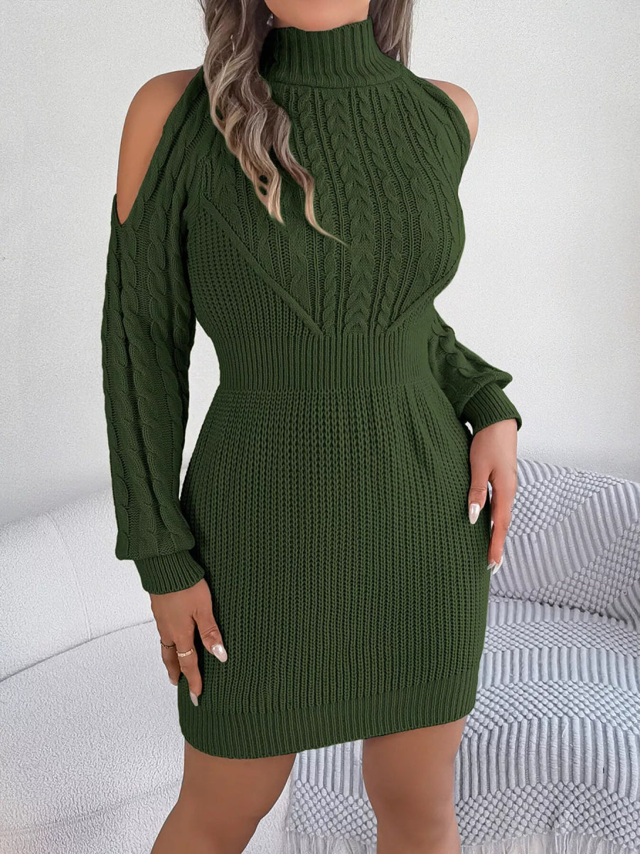Make a statement this season with our Cold Shoulder Cable Knit Turtleneck Sweater Dress. This standout piece blends cozy comfort with modern edge, featuring a chunky cable knit texture, a warm turtleneck, and flirty cold shoulder cutouts.